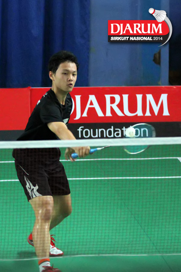 Antonius Chang (Banda Baru Batam) mengembalikan shuttlecock ke arah Rizky Disca (Padaidi).