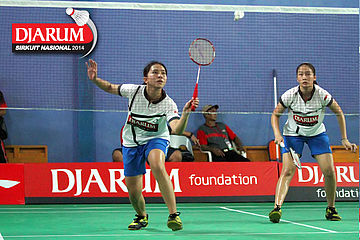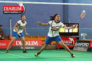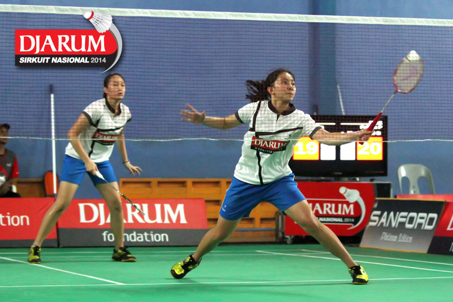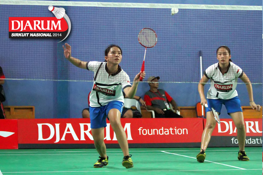 Felicia Parmenas/Mychelle Chrystine (PB Djarum) mengembalikan shuttlecock ke arah Lya Ersalita/Meirisa Cindy (Jaya Raya/Jaya Raya Suryanaga).