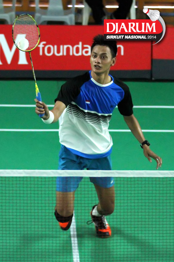 Nugroho Andi (JR Enkei) bersiap menyambar pengembalian tanggung dari Rino Ramadika (Pelatprov PBSI DKI Jakarta).