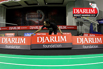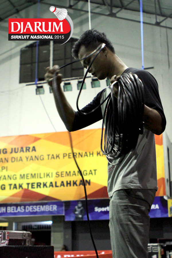Seoarang pekerja saat memasang perlengkapan dekorasi Djarum Sirkuit Nasional Li-Ning NTB Open 2015
