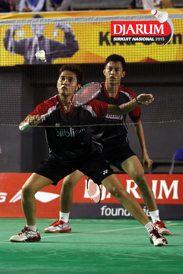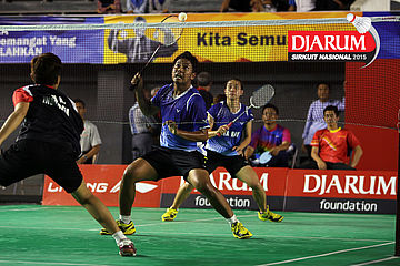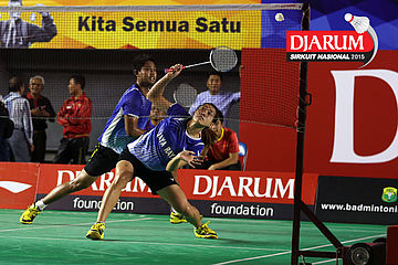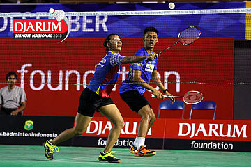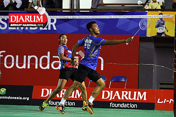 Ardy Nugroho/Lisa Ayu (Djarum Kudus) mengembalikan shuttlecock