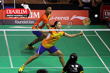 Zachariah Josiahno/Winny Oktavina (Tangkas) bersiap menghadang serangan