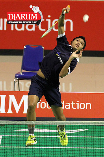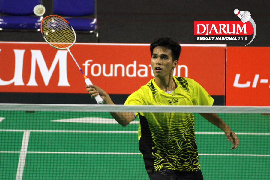Tri Cahyo (Djarum Kudus) mengembalikan shuttlecock.