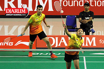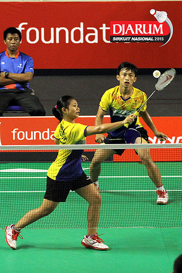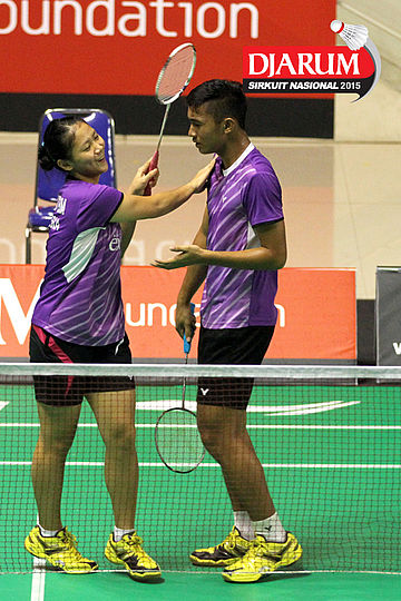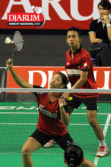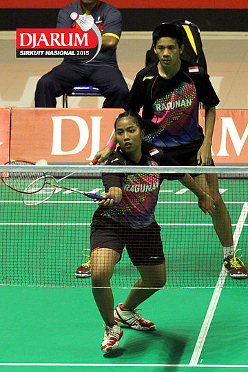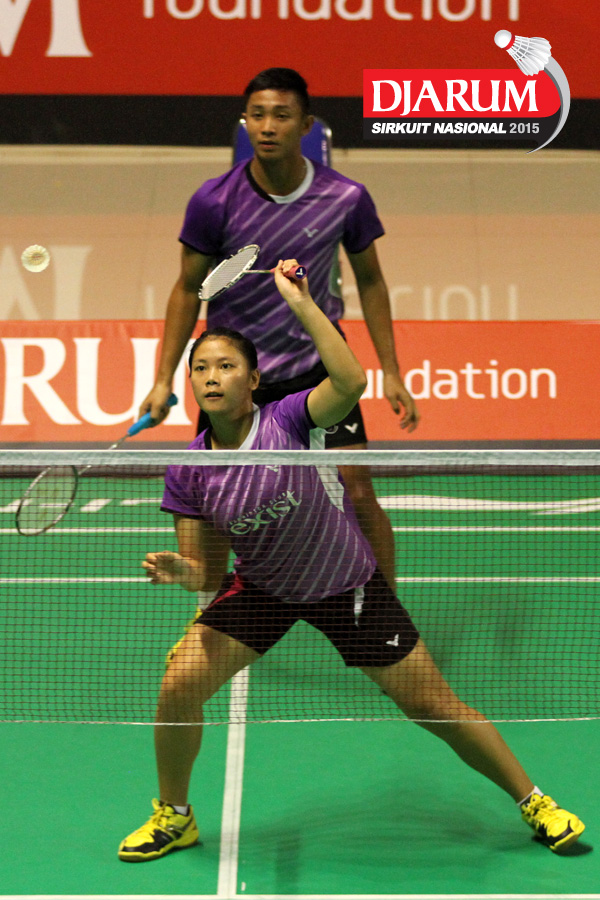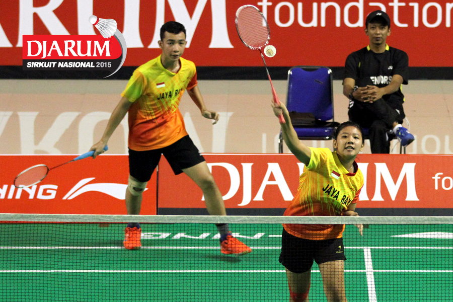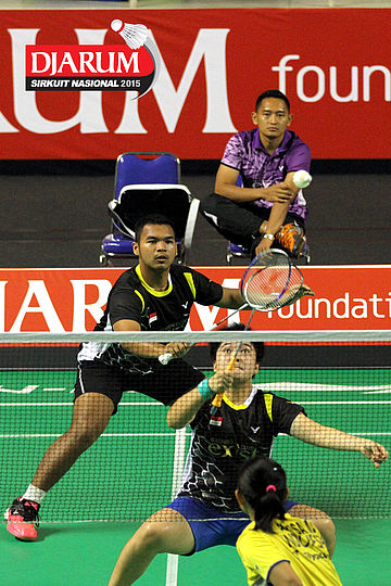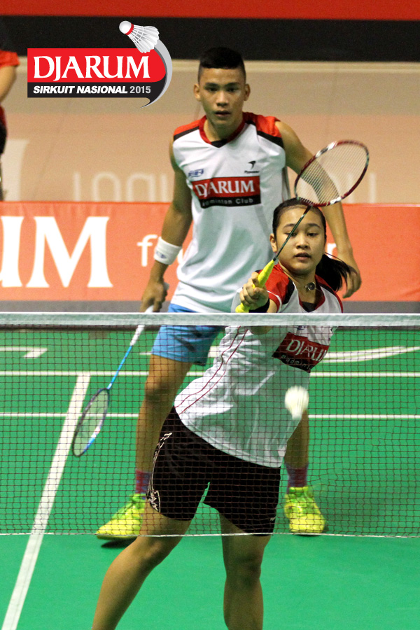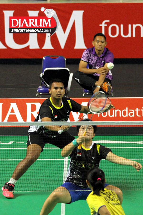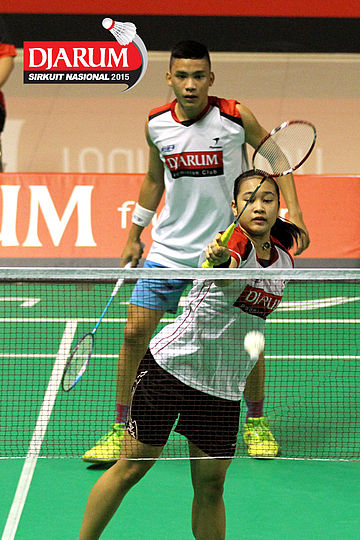 Brian Berri/Lisa Ayu (Djarum Kudus) menyambar pengembalian tanggung.