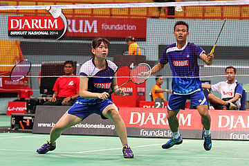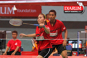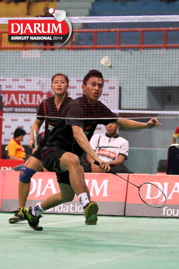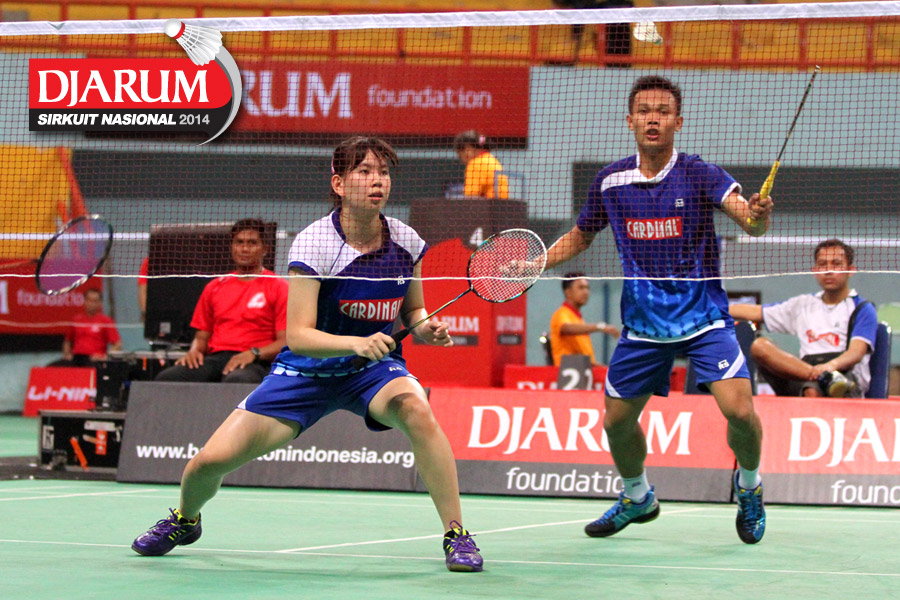 Ridho Bianto/Mychelle Chrystine (PB Djarum) mengembalikan shuttlecock ke arah pasangan M. Fachrikar/Ade Magfiroh (Jaya Raya).