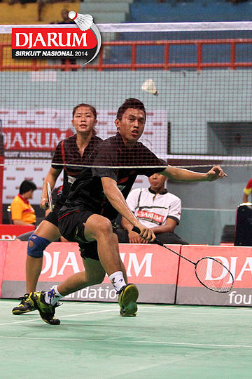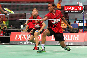 Tedi Supriadi/Jessica Shohan (PB Djarum) bersiap menggapai pengembalian dari pasangan Asnan Mahardika/Rhidatia (Exist/Pelatprov DKI Jakarta).