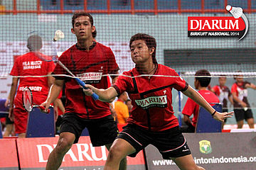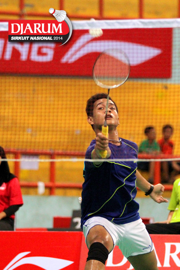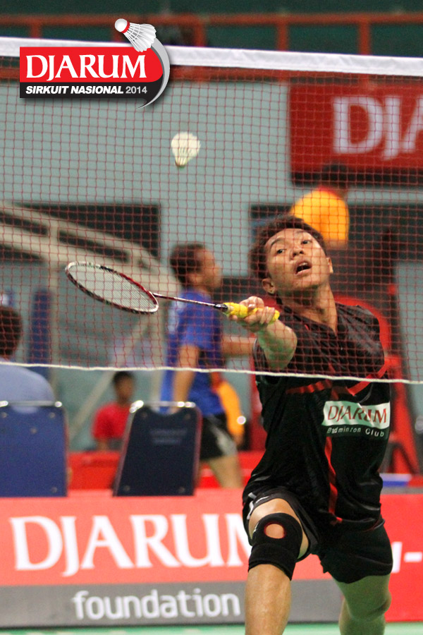 Ryan Fajar (PB Djarum) mengembalikan shuttlecock ke arah Aryanto Haryadi (JR Enkei).