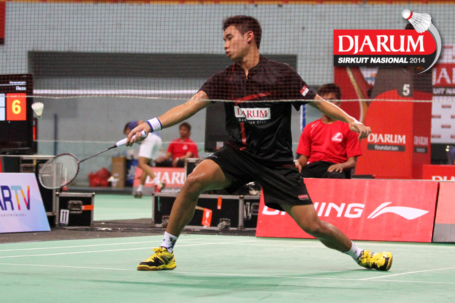 Kho Henrikho (PB Djarum) mengembalikan shuttlecock ke arah Michael (Polda Sulsel).