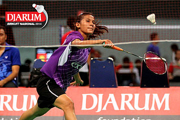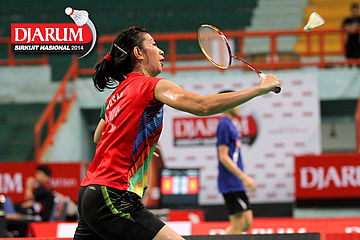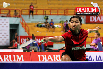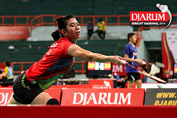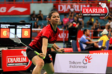 15. Adrianti Firdasari (Jaya Raya) mengembalikan shuttlecock ke arah Rena Asela (PB Djarum).