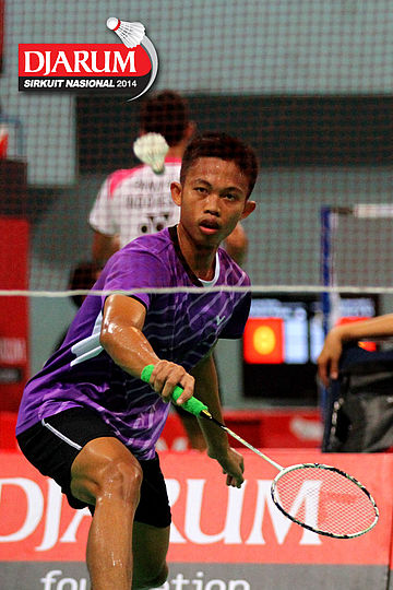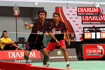 Krisnha Adi (Jaya Raya Suryanaga) mengembalikan shuttlecock ke arah Arif Wahyu (Candra Wijaya).
