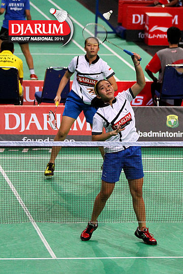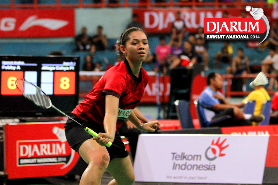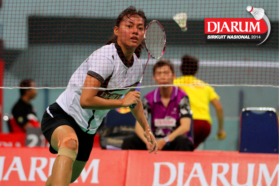 Intan Dwi Jayanti (PB Djarum) mengembalikan shuttlecock ke arah Elizabeth Purwaningtyas (SGS PLN).