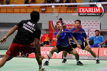 Kevin Ersa/Satrya Aditha (PB Djarum) bersiap menyambut pengembalian dari Christopher Rusdiyanto/Tri Kusuma Wardhana (Jaya Raya Suryanaga).