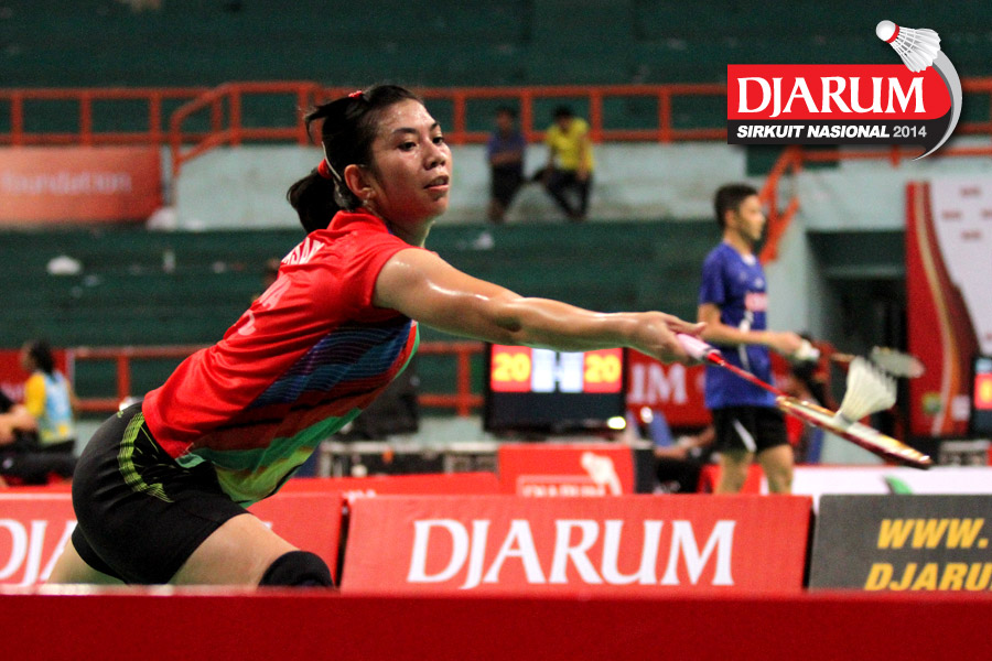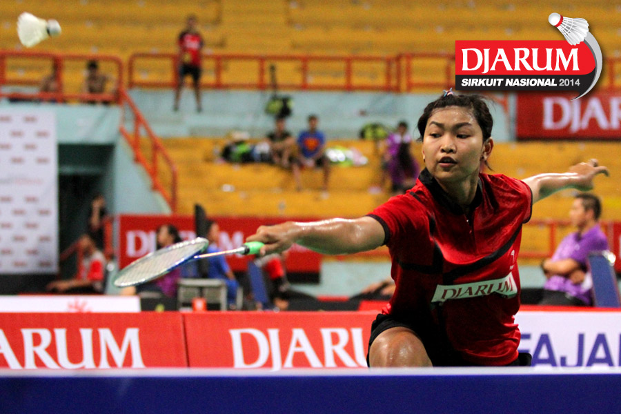Adrianti Firdasari (Jaya Raya) mengembalikan shuttlecock ke arah Rena Asela (PB Djarum).