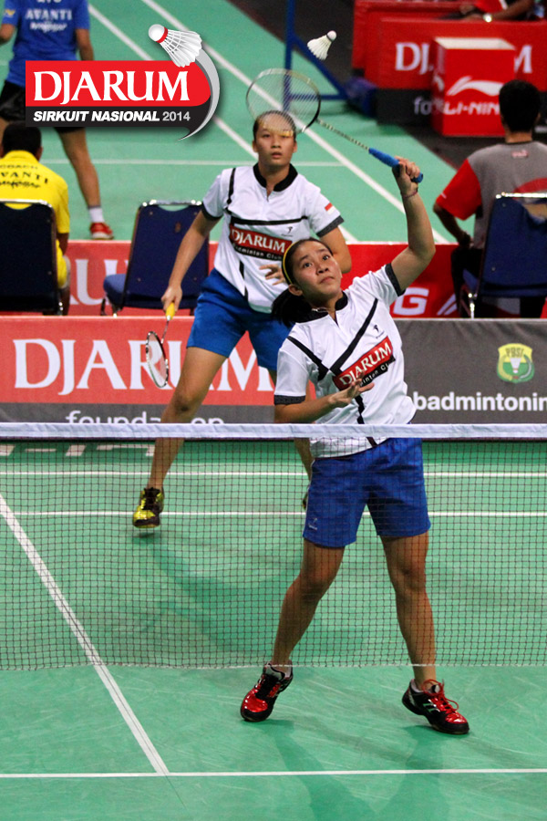 Felicia Parmenas/Mychelle Chrytine (PB Djarum) menyambar pengembalian tanggung yang dilepaskan pasangan Ayu Febyastri/Yulianada (Jaya Raya Suryanaga/Jata Raya Az Zikra).
