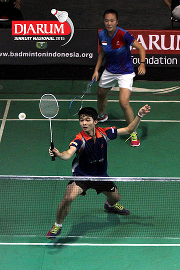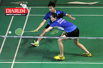 Meldrick Rurado/Monica Nggilu (Candra Wijaya/Mutiara Cardinal) bersiap menyambut pengembalian dari Yohanes Rambitan/Maria Nathalia (Kasih/Focus).