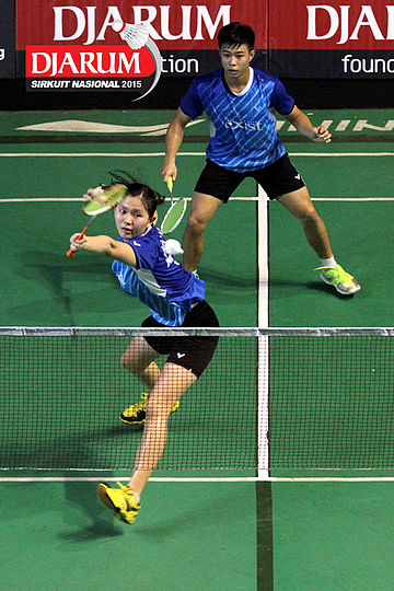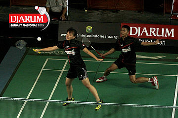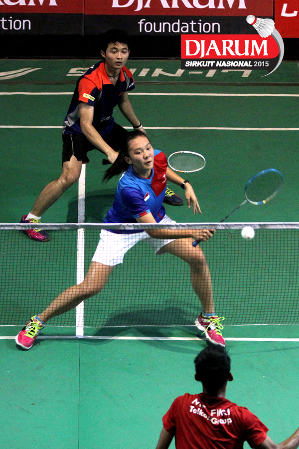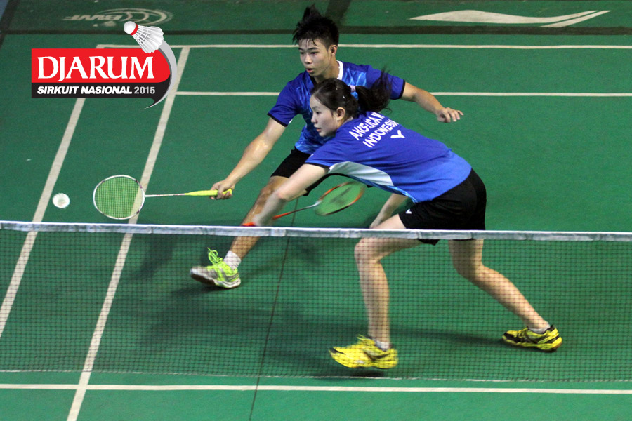 Kelvin Valentino/Vehrenica Debora (Candra Wijaya/Tangkas) mengembalikan shuttlecock ke arah M. Shohibul Fikri/Tria Nur (Pusdiklat Telkom Jabar).