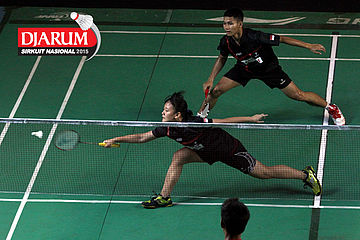M. Shohibul Fikri/Tria Nur (Pusdiklat Telkom Jabar) mengembalikan shuttlecock ke arah Kelvin Valentino/Vehrenica Debora (Candra Wijaya/Tangkas).