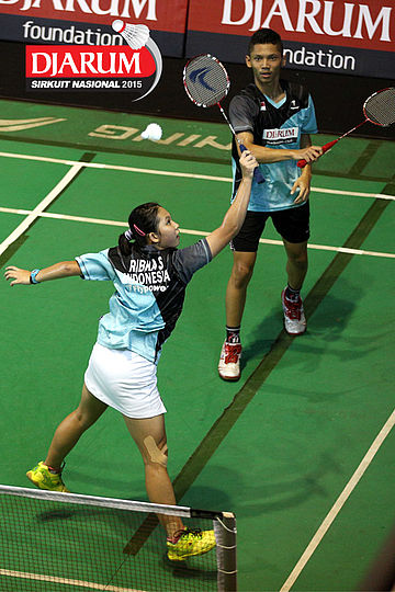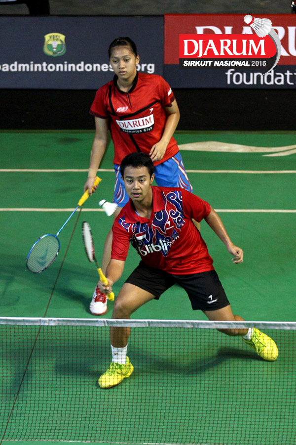 Feisal Wiranto/Ribka Sugiarto (Djarum Kudus) mengembalikan shuttlecock ke arah Ardy Nugroho/Agatha Imanuela (Djarum Kudus).