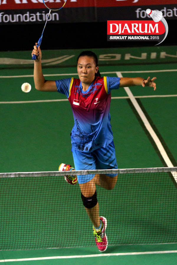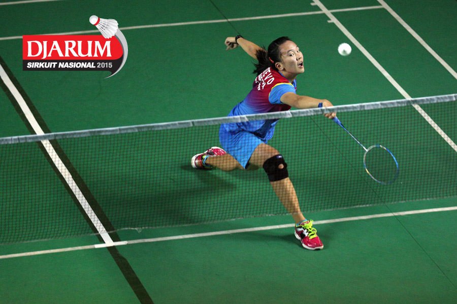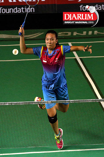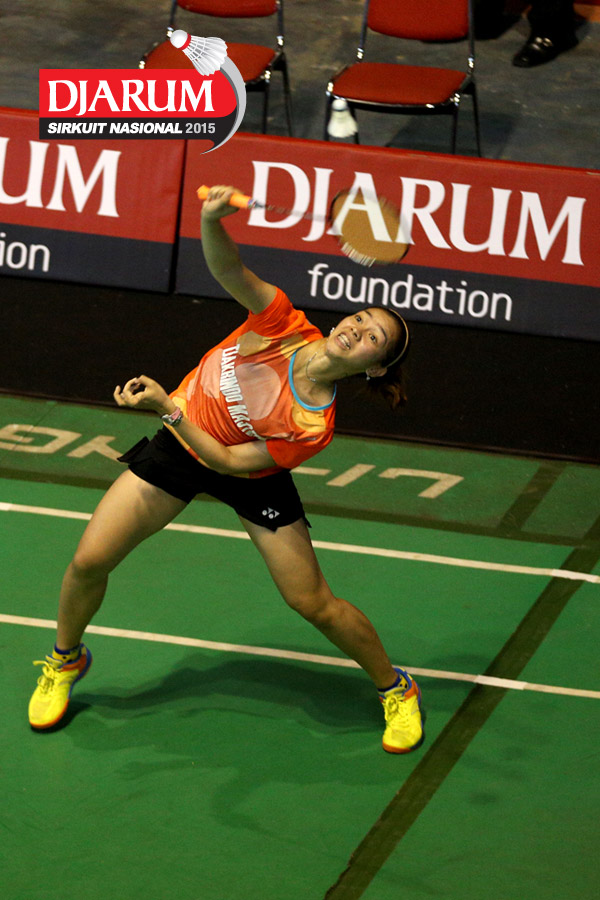 Febby Angguni (Tjakrindo Masters) melepaskan serangan ke arah Ganis Nurramadhani (Pertamina Fastron).