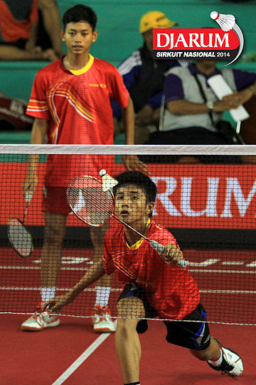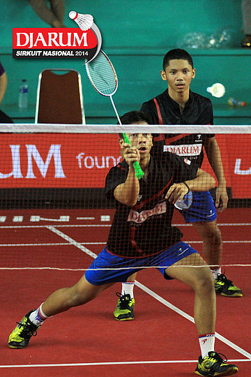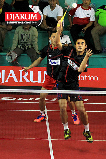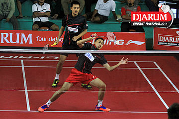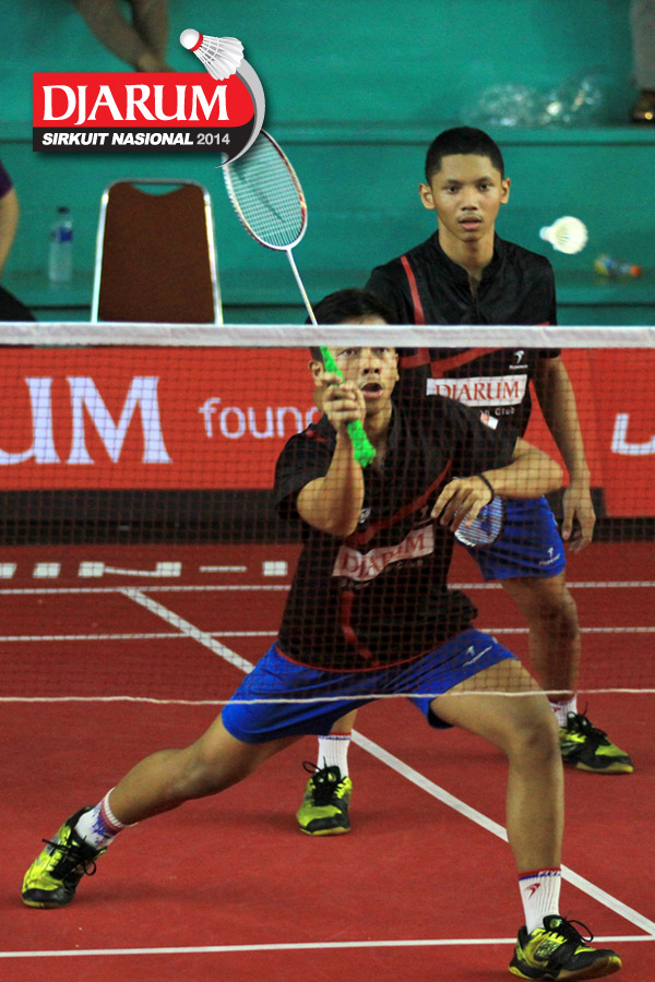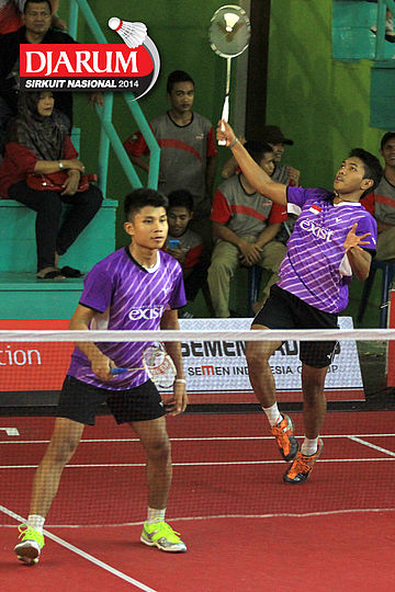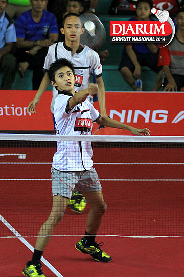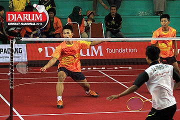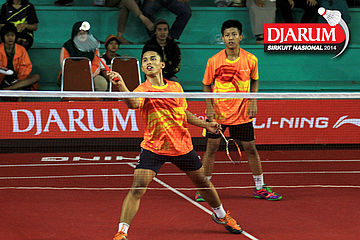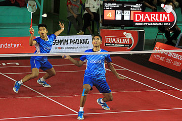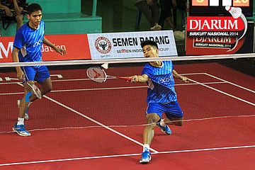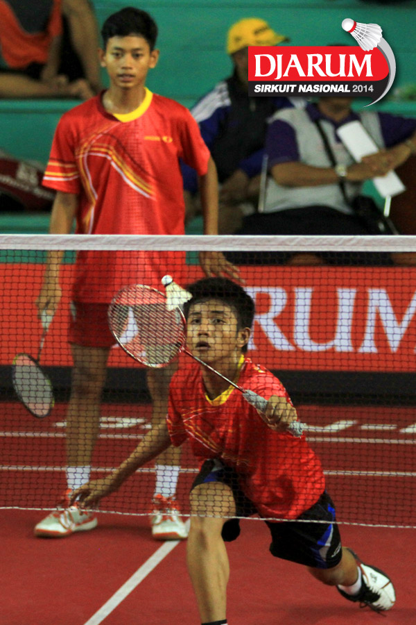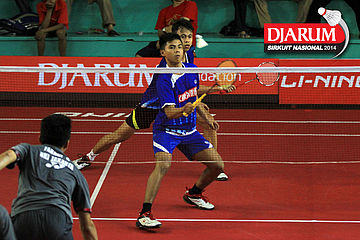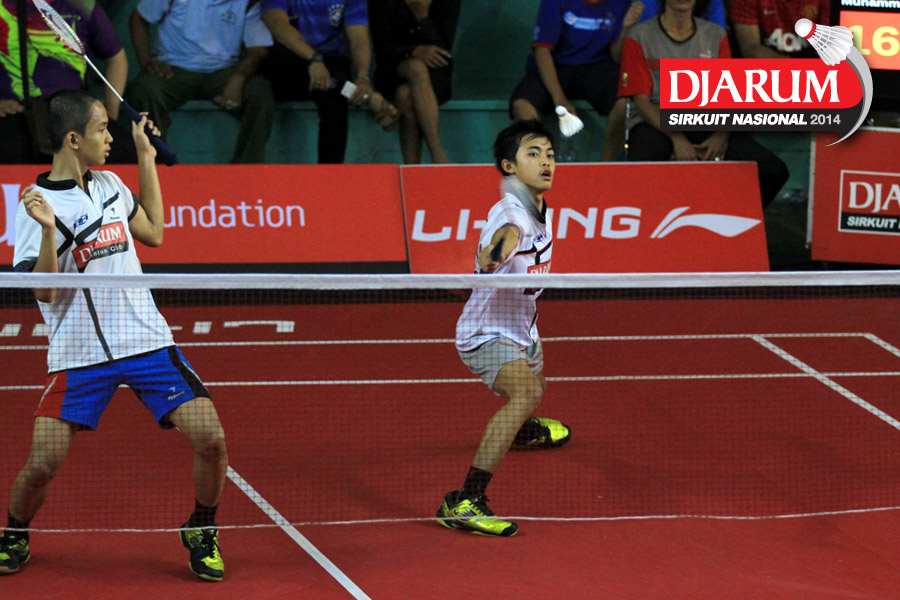 Amri Sahnawi/Anom Bintang (SKO Ragunan) berusaha mengembalikan shuttlecock ke arah Janu Linggar/William (Hi Qua Wijaya Medan)