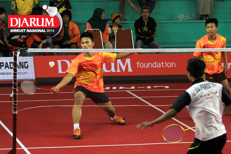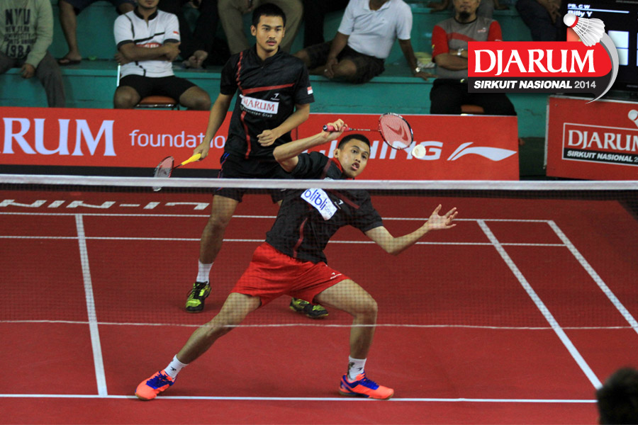 Dicky Cahya/M. Taufiqul (Djarum Kudus) mengembalikan shuttlecock ke arah Angga Surya/M. Annas (Shamrock Medan)