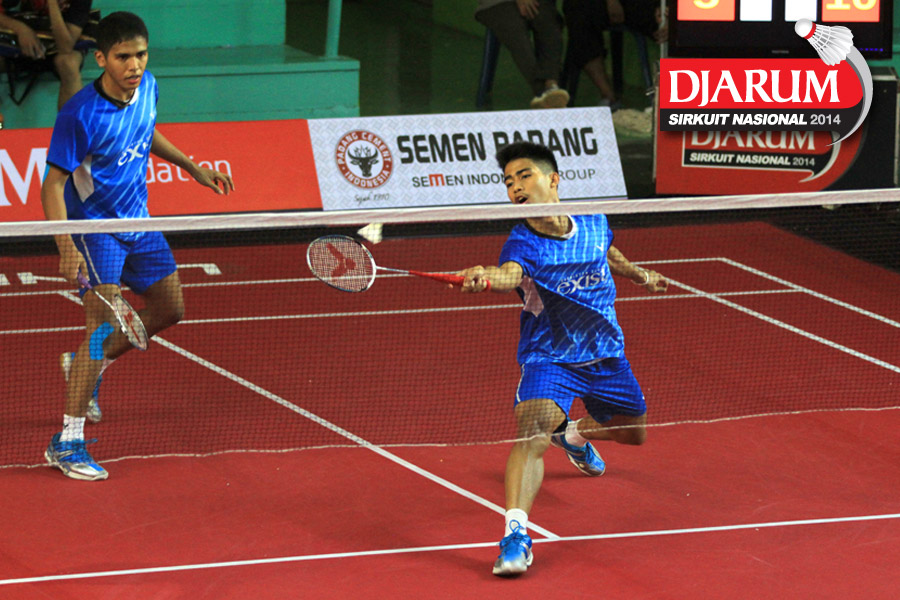 Ahmad Akbar/Otnil Marbowo (Smanor Tadulako) mengembalikan shuttlecock ke arah Imam Ahmad/Yhayang (PPLP DKI Jakarta)