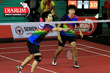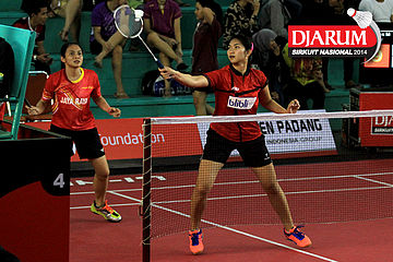 Jessica Muljati/Yulia Yosephine (Shamrock Medan) menyambar pengembalian dari Deariska Putri/Sri Wulan (Djarum Kudus/Jaya Raya)