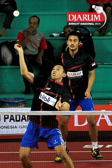 Angger Sudrajat/Tedi Supriadi (Djarum Kudus) bersiap menyambut pengembalian dari Andrean Syahputra/Rezky Akbar (Hi Qua Wijaya)