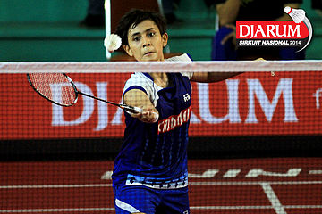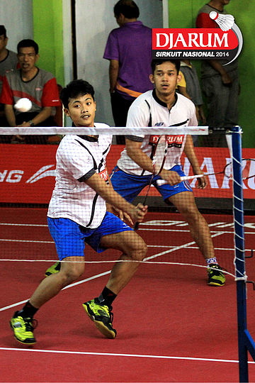 Akbar Bintang/Jeka Wiratama (Djarum Kudus) mengembalikan shuttlecock ke arah Ari Taufik/Randhi Reynaldi (SGS PLN)