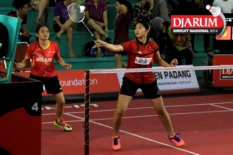 Della Augustia/Ristya Ayu (Djarum Kudus) bersiap menyambut pengembalian dari Nana Hidayati/Rani Wahyuni (PBSI Bukit Tinggi)