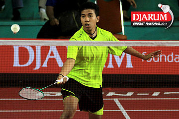 Alamsyah Yunus (JR Enkei) mengembalikan shuttlecock ke arah Christofle Brians (Pelatprov DKI Jakarta)