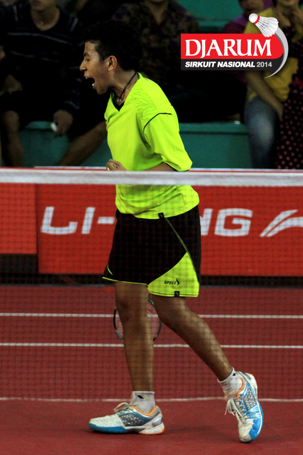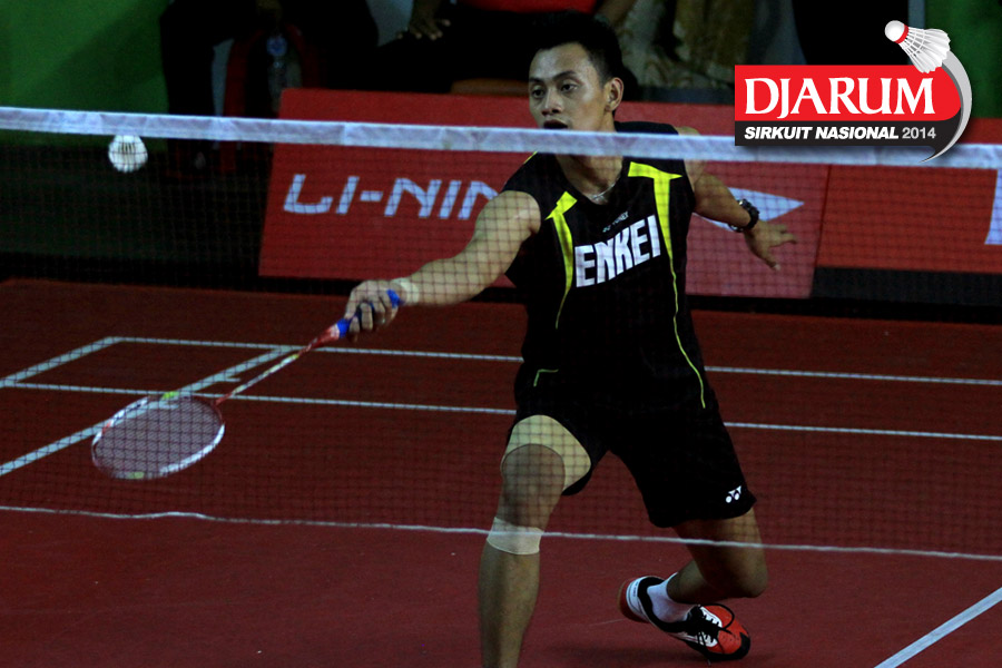 Nugroho Andi (JR Enkei) mengembalikan shuttlecock ke arah M. Nizar (Pelatprov DKI Jakarta)