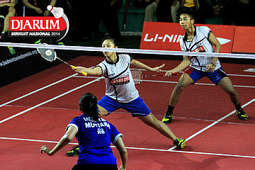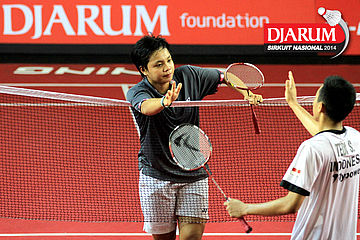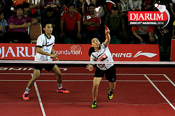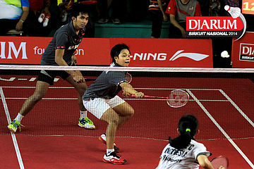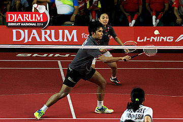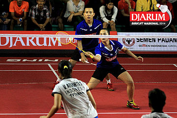 M. Robi Darwis/Monika Insany (Mutiara Cardinal) mengembalikan shuttlecock ke arah Devand Riefky/Vania Arianti (Djarum Kudus)