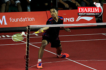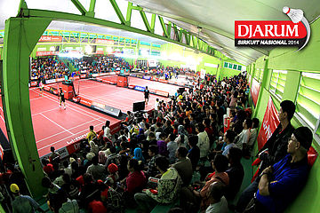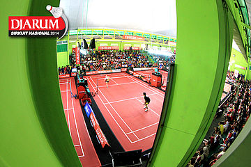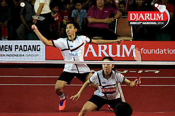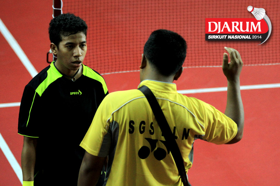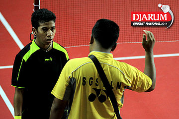 Redy Perdana (Pusdiklat Telkom) mengembalikan shuttlecock ke arah M. Lutfi Erlangga (Mutiara Cardinal)