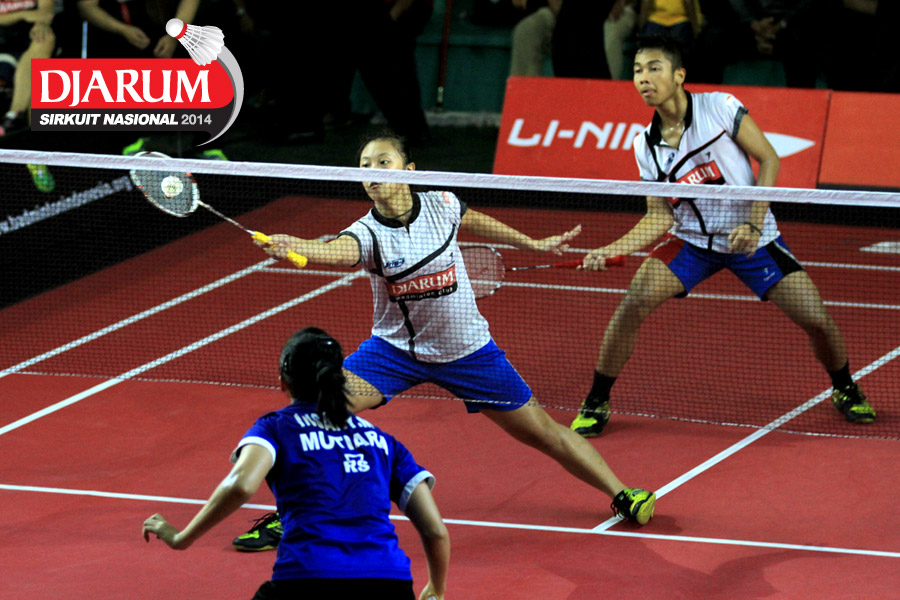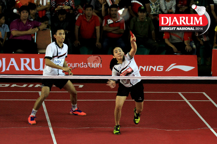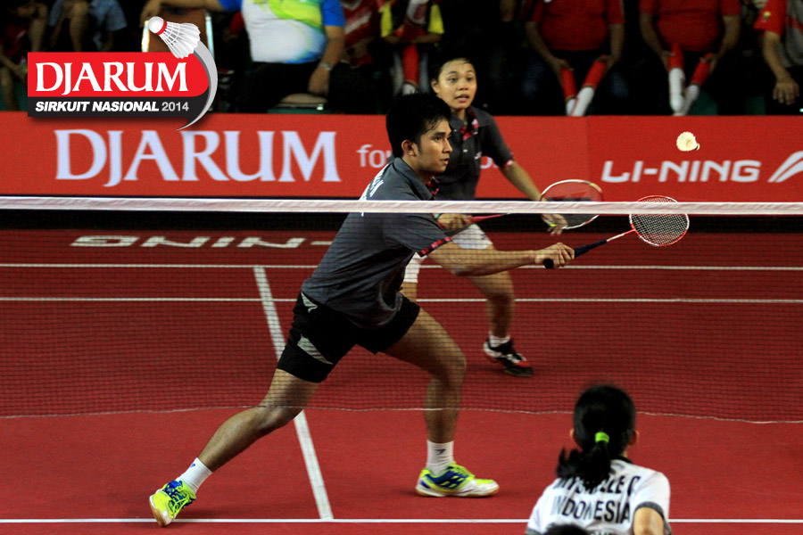 Tedi Supriadi/Mychelle Crhystine (Djarum Kudus) menyambar pengembalian dari Fauzi Habibi/Apriyani Rahayu (Pelatprov DKI Jakarta)