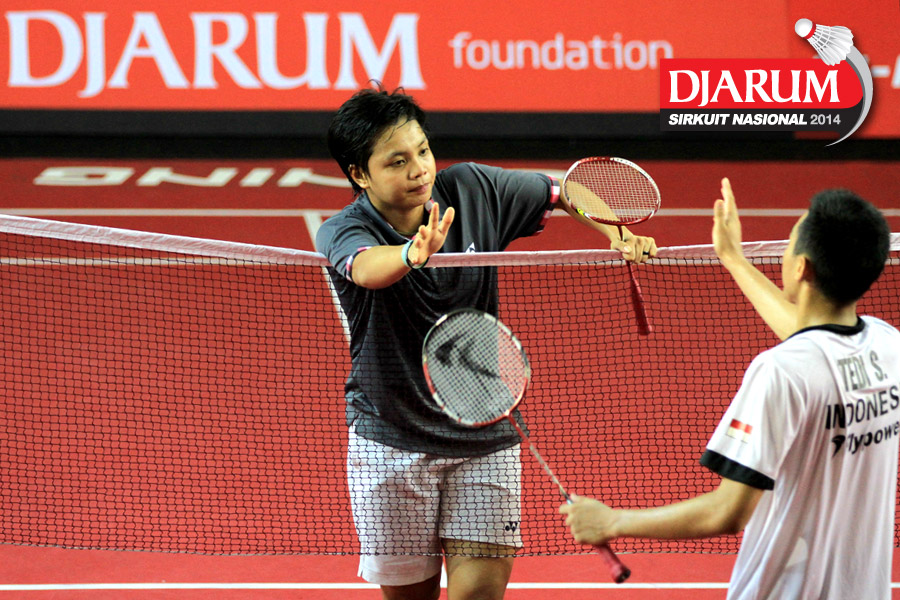 Apriyani Rahayu (Pelatprov DKI Jakarta) bersalaman dengan Tedi Supriadi (Djarum Kudus) usai bertanding