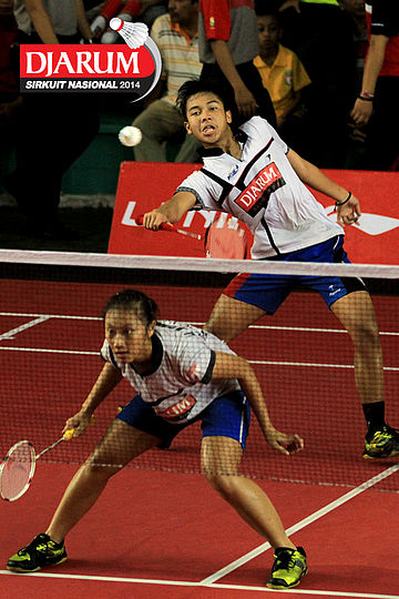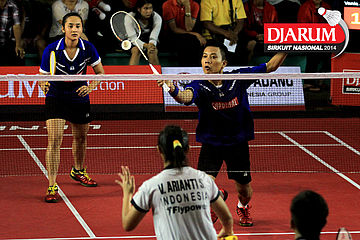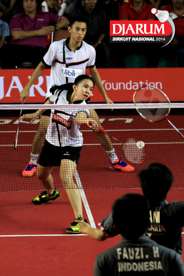 Tedi Supriadi/Mychelle Crhystine (Djarum Kudus) mengembalikan shuttlecock ke arah Fauzi Habibi/Apriyani Rahayu (Pelatprov DKI Jakarta)