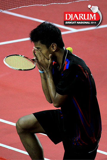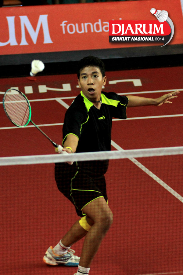 Ekspresi Redy Perdana (Pusdiklat Telkom) setelah memastikan diri sebagai juara tunggal taruna putra Djarum Sirkuit Nasional Li-Ning Sumatera Barat Open 2014