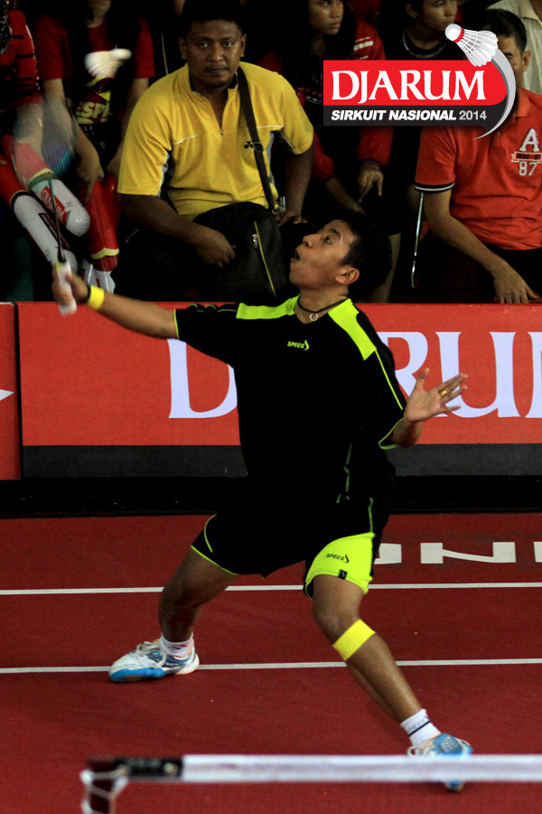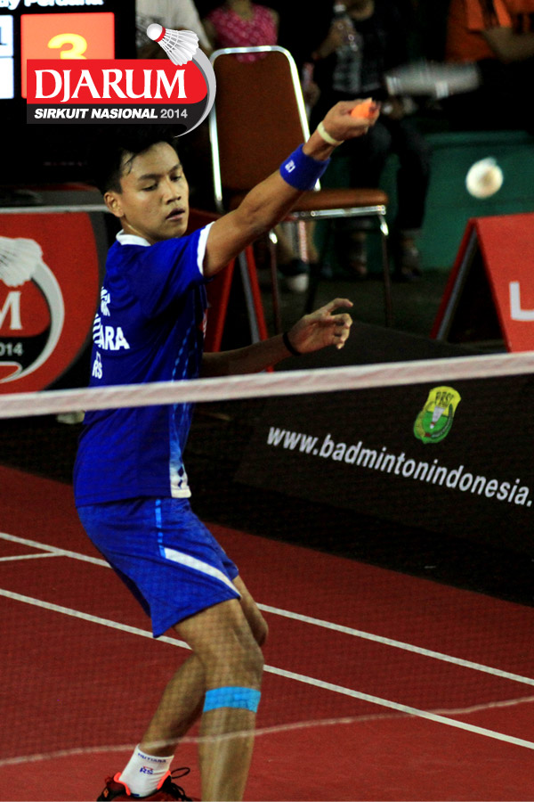 M. Lutfi Erlangga (Mutiara Cardinal) mengembalikan shuttlecock ke arah Redy Perdana (Pusdiklat Telkom)