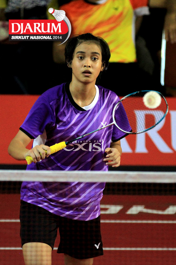 Elizabeth Purwaningtyas (SGS PLN) mengembalikan shuttlecock ke arah Aprilia Yuswandari (Semen Gresik)