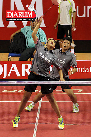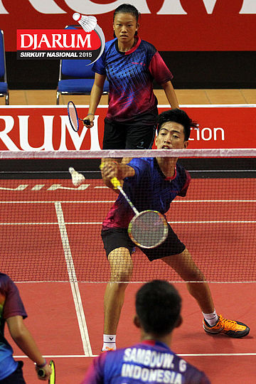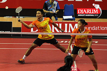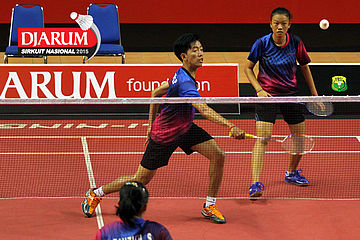Harum Dinar/Tania Oktaviani (Djarum Kudus) mengembalikan shuttlecock ke arah M. Agung Gumilar/Aghisna (Hi Qua Wima/Semen Gresik)