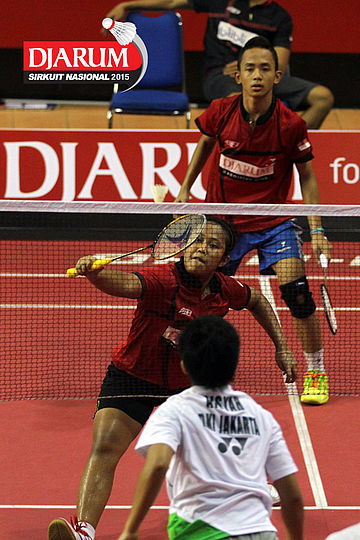 M. Wildan Maulana/Jauza Fadhila (Pelatprov PBSI DKI Jakarta) mengembalikan shuttlecock ke arah Komadani Maytri/Angelina Natasha (Jaya Raya Suryanaga/Semen Gresik)