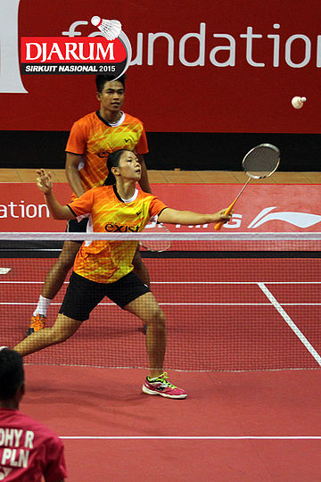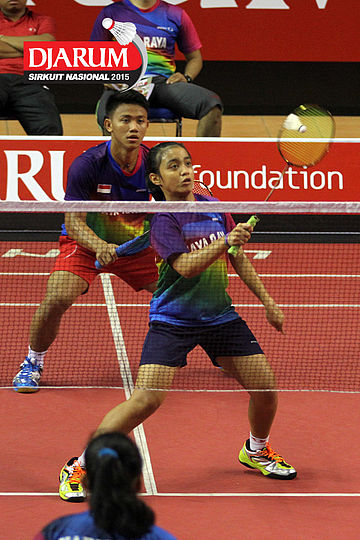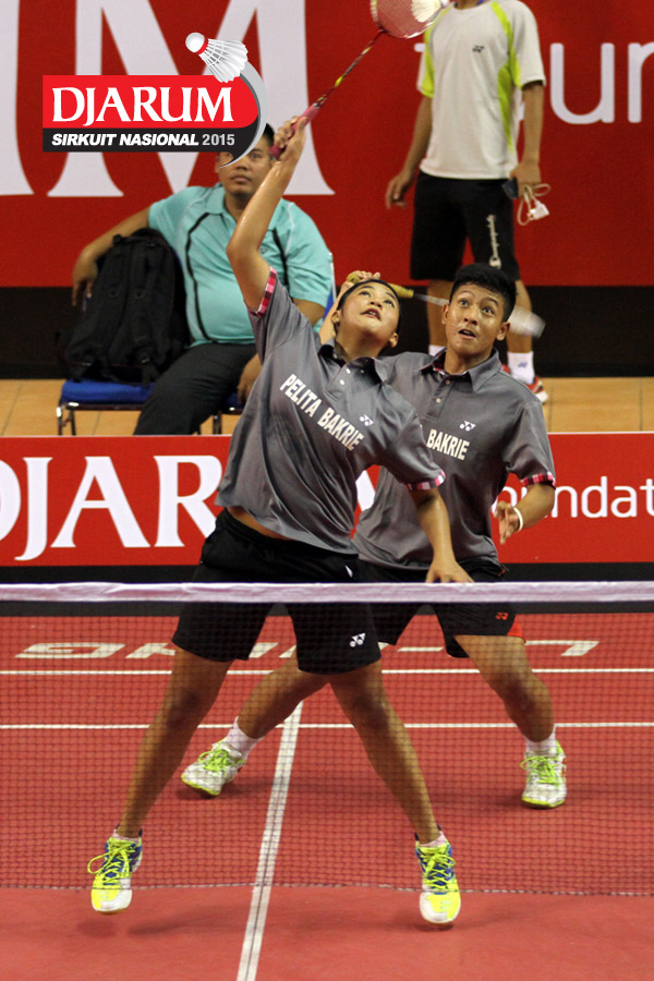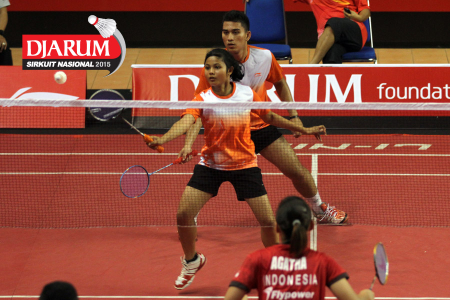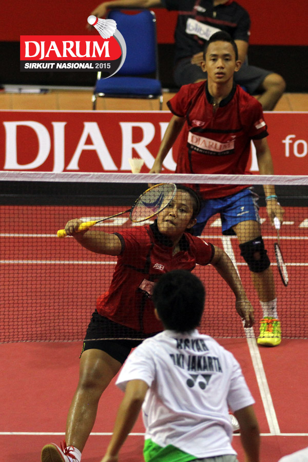 Riezky Admajayandi/Nurul Fothanah (Pusdiklat SMA Olahraga Riau) mengembalikan shuttlecock ke arah Feisal Wiranto/Agatha Imanuela (Djarum Kudus)