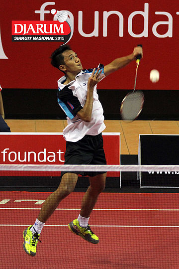 Arif Wahyu Setiawan (CWIBC) melepaskan smash ke arah M. Fathlurahman (Aufa Kalsel)