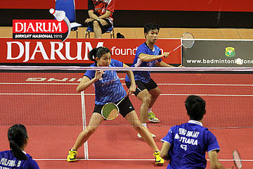 Fauzi Habibi/Apriyani Rahayu (Pelatprov PBSI DKI Jakarta) mengembalikan shuttlecock ke arah Galang Decky/Vania Arianti (Djarum Kudus)