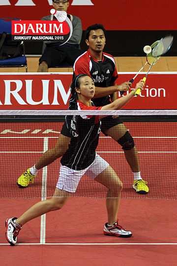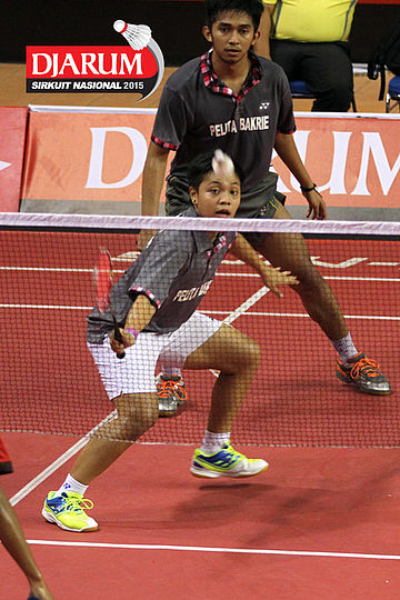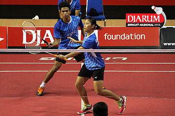 M. Rijal/Della Augustia (Djarum Kudus) menghadang pengembalian dari Ardiansyah Putra/Devi Tika Permatasari (Berkat Abadi)
