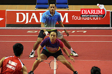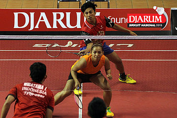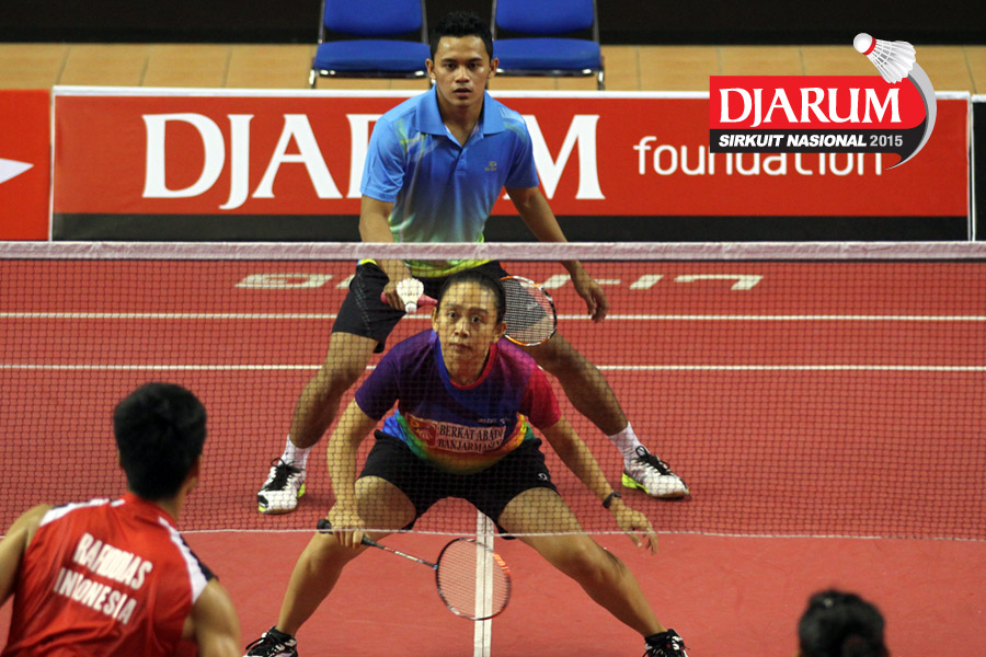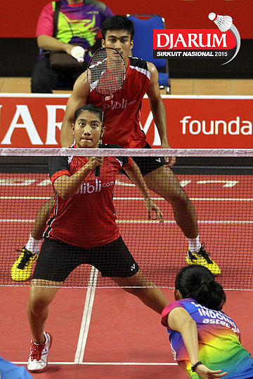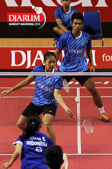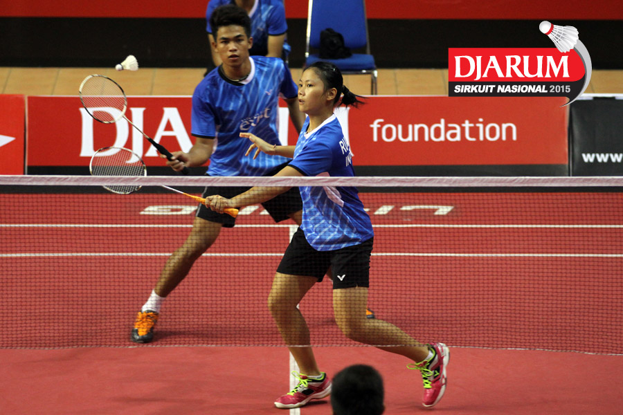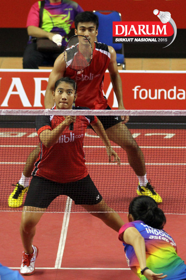 Akbar Gusti/Felicia Parmenas (Djarum Kudus) menghadang serangan yang dilepaskan Yufi Virgyanda/Anggi Maharani (Indocafe Medan/SKO Ragunan)