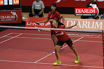 Galang Decky/Vania Arianti (Djarum Kudus) menyambar serve dari Fauzi Habibi/Apriyani Rahayu (Pelatprov PBSI DKI Jakarta)