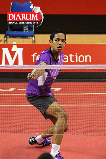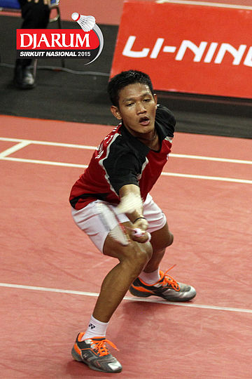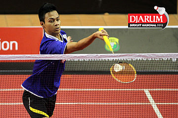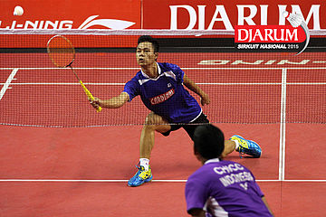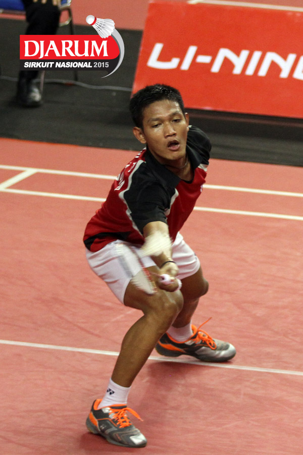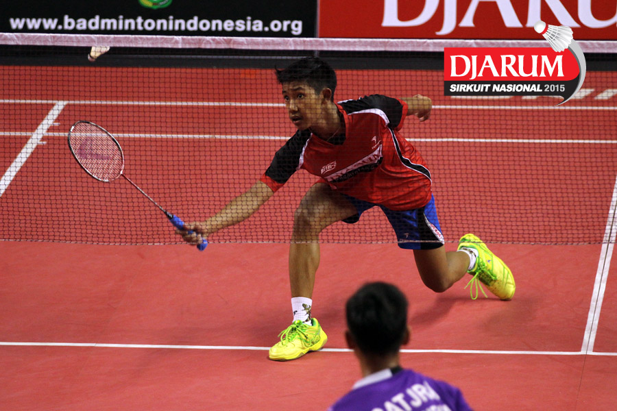 Alamsyah Yunus (JR Enkei) mengembalikan shuttlecock ke arah Panji Akbar (Pelatprov PBSI DKI Jakarta)