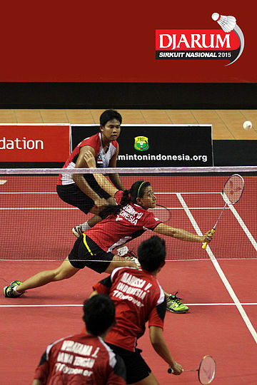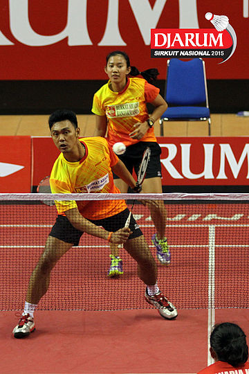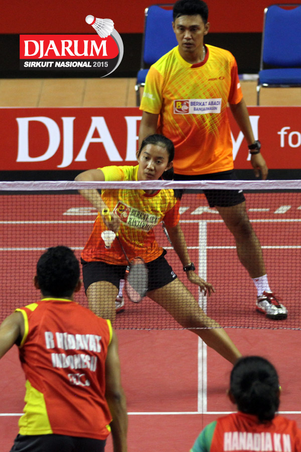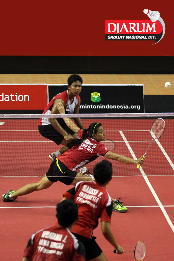 Irfan Fadhillah/Weni Anggraini (Jaya Raya) mengembalikan shuttlecock ke arah Jeka Wiratama/Vita Marissa (Djarum Kudus)